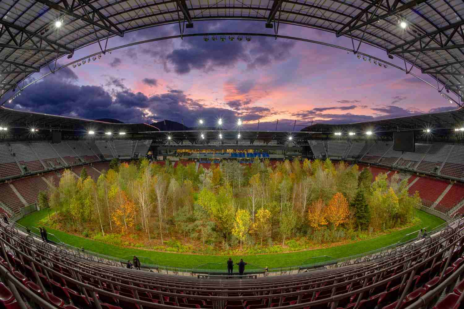 Nel 2019 lo stadio Wörthersee di Klagenfurt, in Austria, ha ospitato una delle installazioni artistiche più provocatorie degli ultimi anni. Si tratta di For Forest, un progetto ideato dal commissario d’arte Klaus Littmann, che ha trasformato lo spazio sportivo in un vero e proprio bosco urbano, con l’inserimento di 300 alberi di 18 specie diverse.