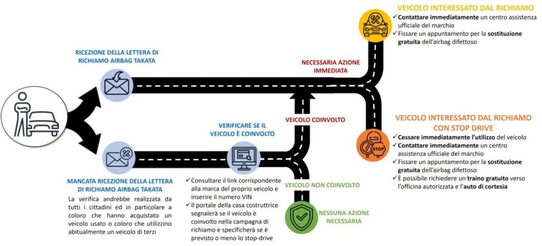 Negli ultimi anni le campagne di richiamo degli airbag Takata in Italia hanno coinvolto circa 4 milioni di veicoli appartenenti a numerose Case automobilistiche, con 3,2 milioni di veicoli notificati. Tuttavia ad oggi risultano ancora circolanti 1,6 milioni di veicoli equipaggiati con airbag Takata difettosi. Per questo motivo, il ministero delle Infrastrutture e dei Trasporti ha deciso di sensibilizzare gli automobilisti italiani rispetto all’adesione alle campagne di richiamo lanciate dalle case costruttrici, facilitando la verifica online della propria vettura. Ricordiamo che la mancata sostituzione del componente difettoso espone a un rischio significativo di lesioni gravi o anche fatali, come purtroppo è già accaduto, particolarmente per i modelli più datati o utilizzati in contesti climatici caratterizzati da forte umidità, alte temperature o forte escursione termica.