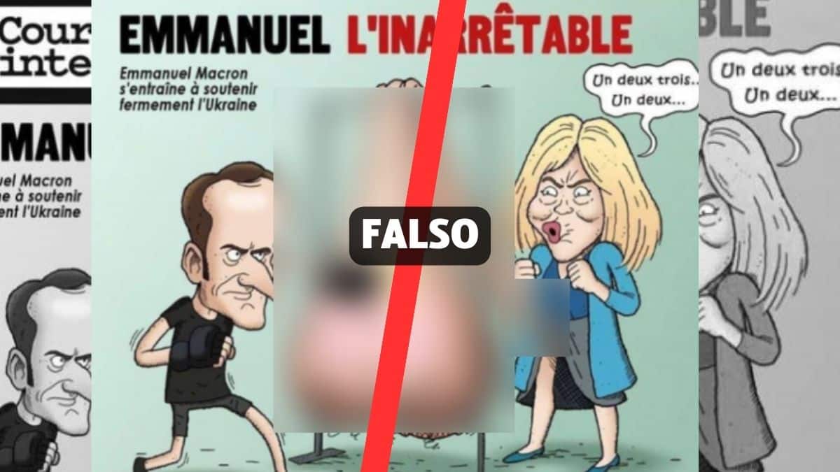 Una vignetta in cui il presidente francese Emmanuel Macron si allena prendendo a pugni i testicoli di sua moglie Brigitte. Lo sketch fa riferimento a una recente foto pubblicata dall’inquilino dell’Eliseo in cui lo si vede allenarsi prendendo a pugni un sacco da boxe, e a una bufala storica secondo cui Brigitte Macron sarebbe una donna transessuale, nata maschio, tornata in voga negli ultimi tempi in almeno altre due occasioni. Una più classica e un’altra con una falsa copertina di Charlie Hebdo. La vignetta sembra essere stata condivisa sul settimanale francese Courrier International. Ma non è mai stata pubblicata dal settimanale francese.