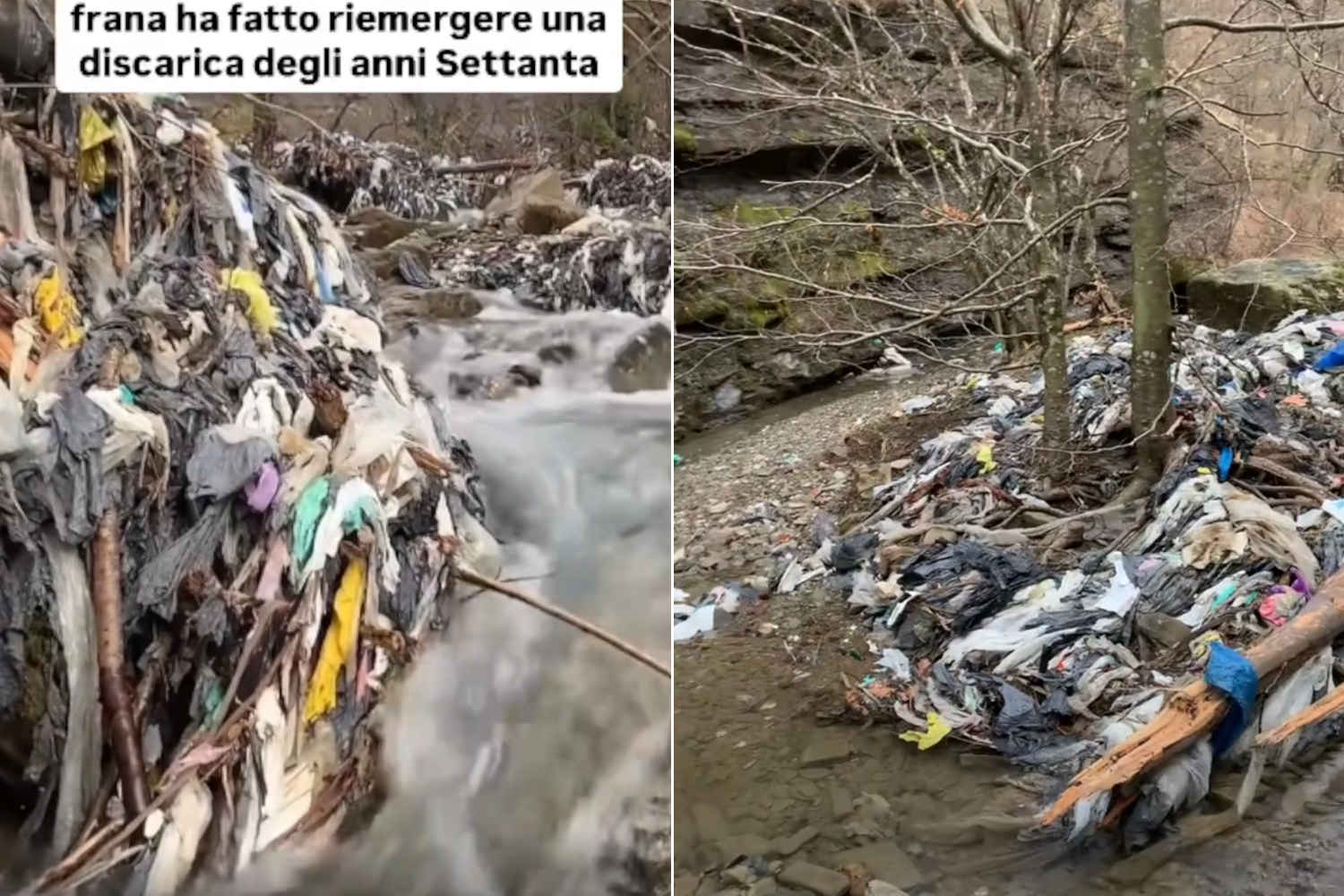 Frana fa riemergere una vecchia discarica che si riversa nel torrente Rovigo, ora sommerso di plastica e rifiuti