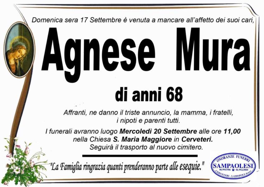Come comunicato questa mattina attraverso il necrologio, Cerveteri è in lutto per la scomparsa di Agnese Mura, storica dipendente comunale di Cerveteri venuta a mancare all’ età di 68anni.