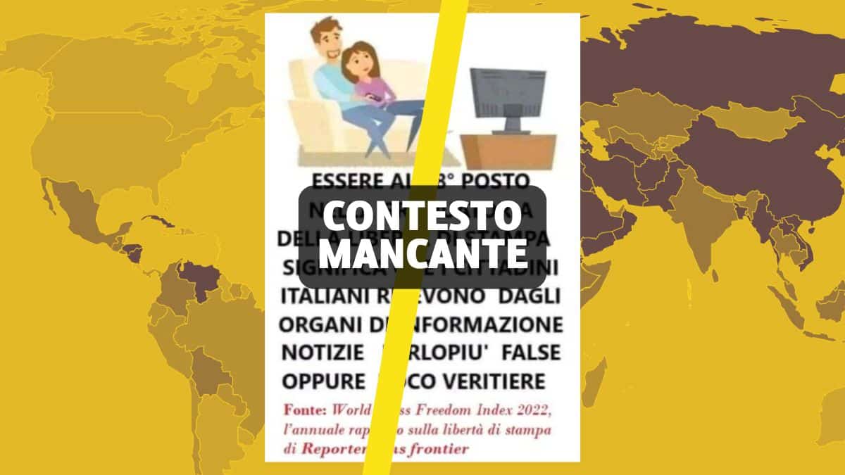 Circola un’immagine dove viene riportata una presunta citazione tratta dal rapporto 2022 di Reporters Without Borders sulla libertà di stampa in Italia. L’obiettivo è quello di indicare la posizione del nostro Paese nella speciale classifica della ONG, all’epoca al numero 58, alla disinformazione da parte dei media. Tale citazione, però, non risulta nel rapporto e viene – ancora una volta – omessa la metodologia usata per stilare la classifica.