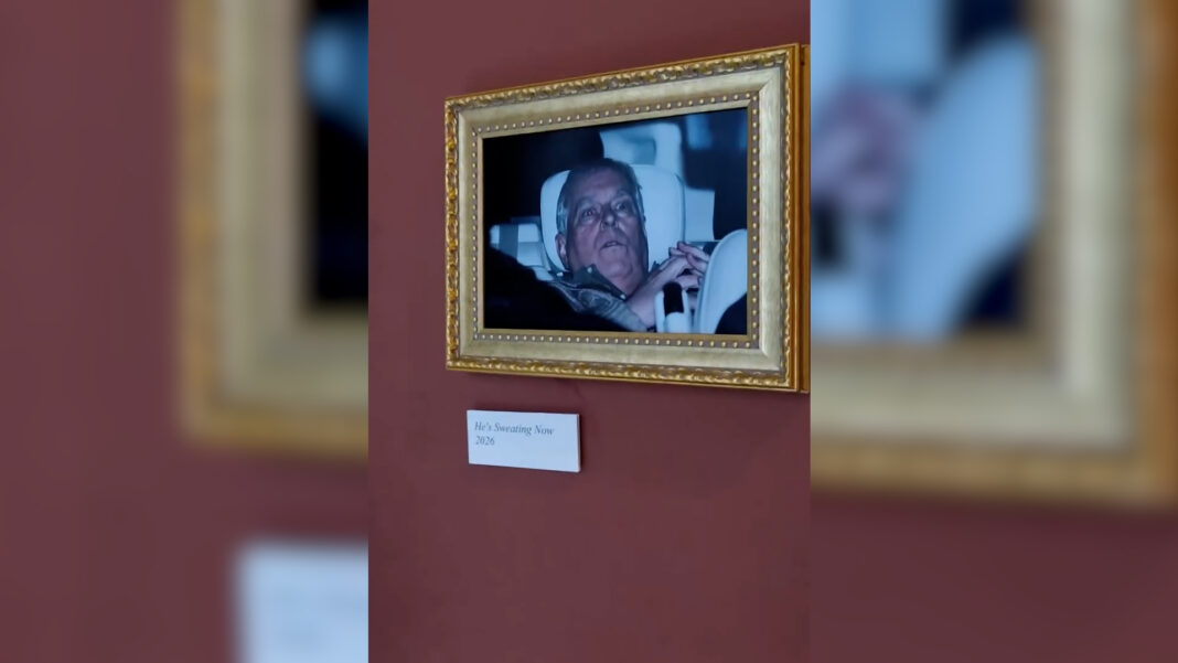 La foto è stata scattata dal fotografo della Reuters Phil Noble dopo l’arresto di Mountbatten-Windsor, avvenuto giovedì nella tenuta di Sandringham, con l’accusa di cattiva condotta nell’esercizio delle sue funzioni pubbliche. Sotto la cornice gli attivisti hanno attaccato al muro un cartello con la scritta: “Ora sta sudando” con sotto scritto 2026.