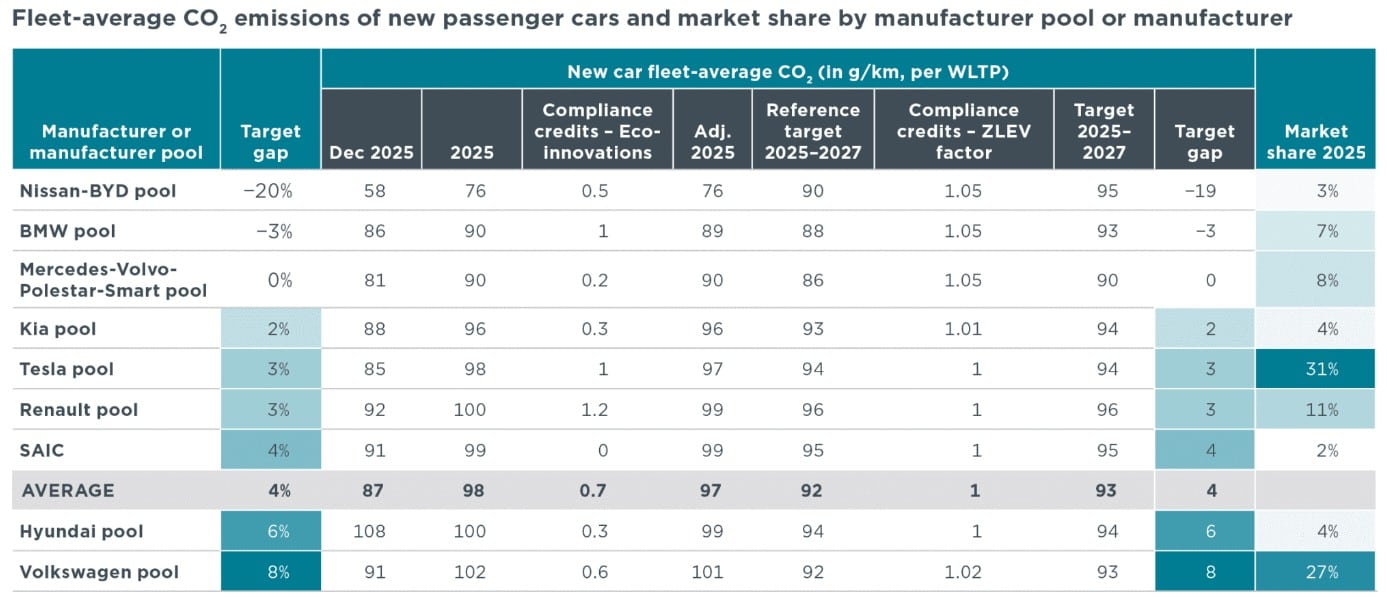 Nei mesi scorsi la Commissione europea ha introdotto un meccanismo di flessibilità triennale (2025 – 2027) in modo che le aziende automobilistiche potessero disporre di tre anni di tempo, invece di uno, per adeguarsi ai nuovi e più stringenti limiti sulle emissioni di CO2, evitando così le salatissime multe che altrimenti sarebbero già scattate l’anno scorso. Tuttavia la ‘boccata d’ossigeno’ non è infinita: il 2027, infatti, è praticamente dietro l’angolo e, a meno di improbabili nuove proroghe, le Case auto dovranno dimostrare di avere rispettato il severo target di 93,6 g/km di CO2. Ce la faranno? Ebbene, se nel 2025 la situazione era quasi ‘tragica’ (Volkswagen, per esempio, aveva stimato di dover pagare una mega multa di 1,5 miliardi di euro), l’anno prossimo potrebbe andare decisamente meglio.
