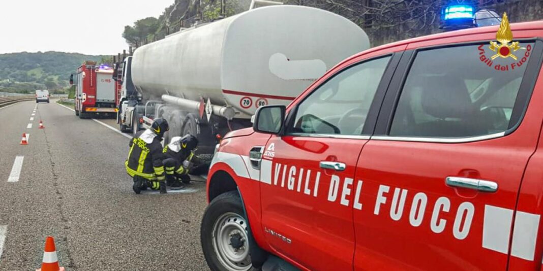 Secondo quanto riferito, il conducente dell’autocisterna ha prontamente richiesto l’intervento dei soccorsi dopo essersi accorto del problema. Sul posto sono intervenute rapidamente le squadre dei Vigili del Fuoco con un’APS (Auto Pompa Serbatoio) e un modulo antincendio, riuscendo a contenere le fiamme e a limitare i danni al mezzo.