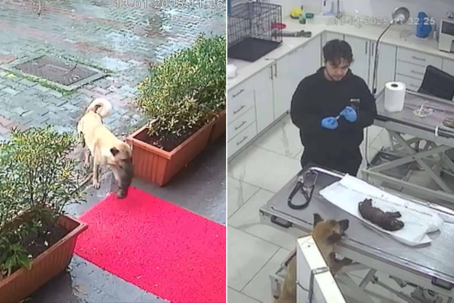 Questo gesto di disperazione e speranza è stato catturato dalle telecamere di sicurezza della clinica, mostrando la madre che trasportava il cucciolo con delicatezza in bocca, fermandosi solo una volta raggiunto l’ingresso. All’arrivo del cane, il veterinario Baturalp Oğhan ha immediatamente preso in cura il cucciolo.