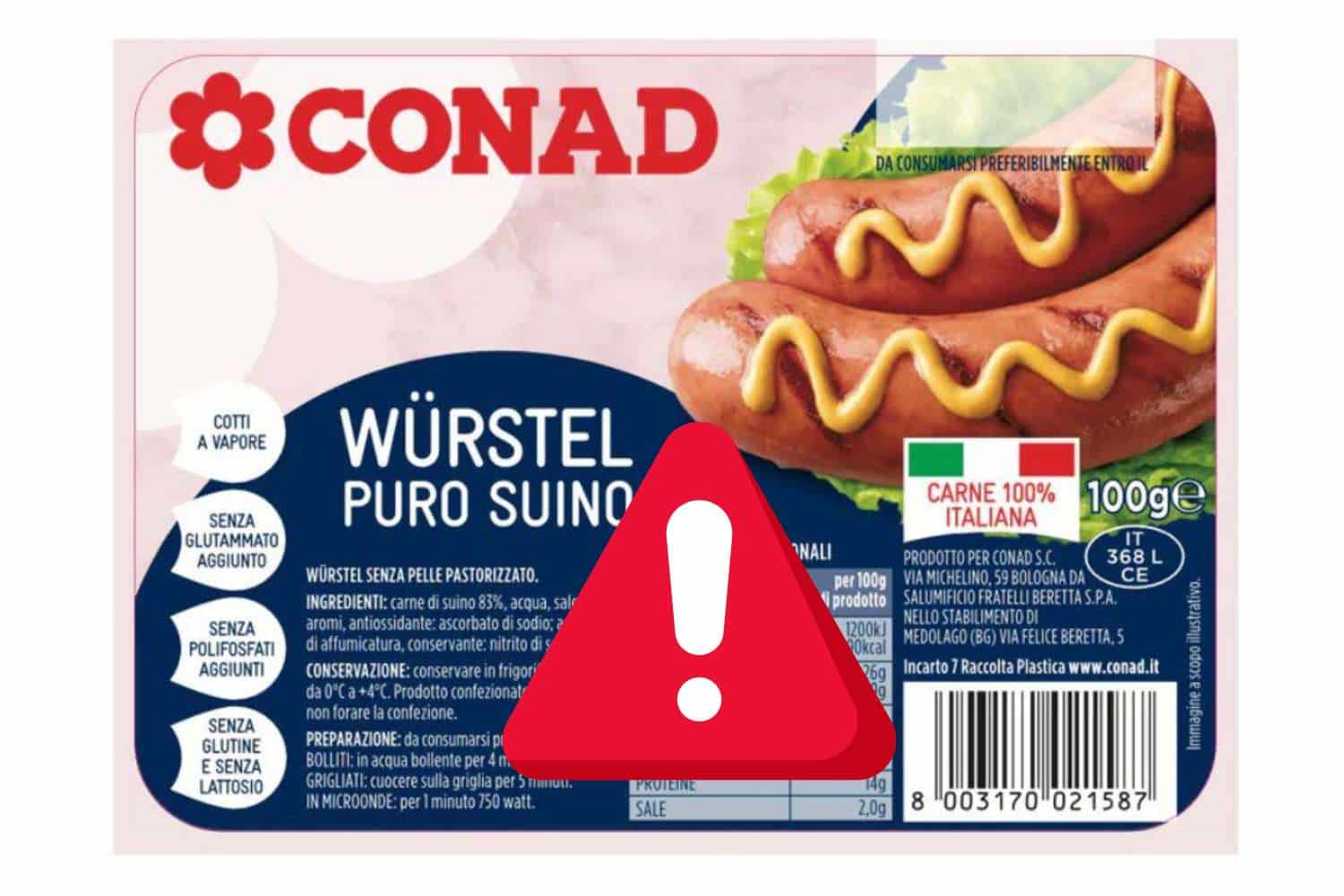 Conad ha richiamato un lotto di wurstel di suino per la presenza di tracce di proteine del latte non dichiarate in etichetta, che potrebbero rappresentare un rischio per i consumatori allergici