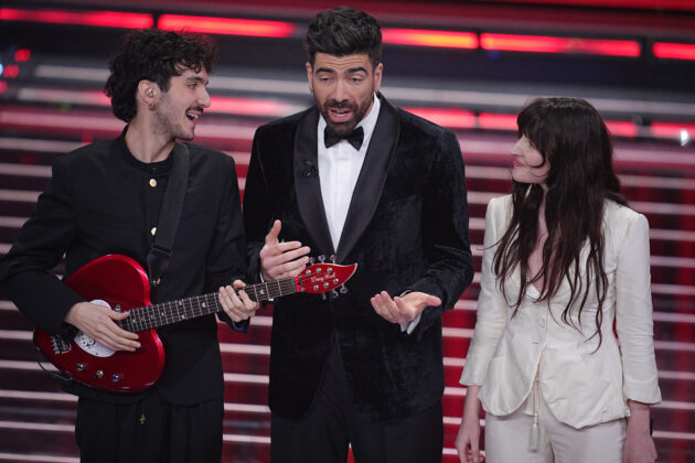 Mazzariello, Gianluca Gazzoli and Angelica Bove during the 76th edition of the Sanremo Italian Song Festival at the Ariston Theatre in Sanremo, northern Italy – Wednesday, February 25, 2026. Entertainment. (Photo by Marco Alpozzi/LaPresse)