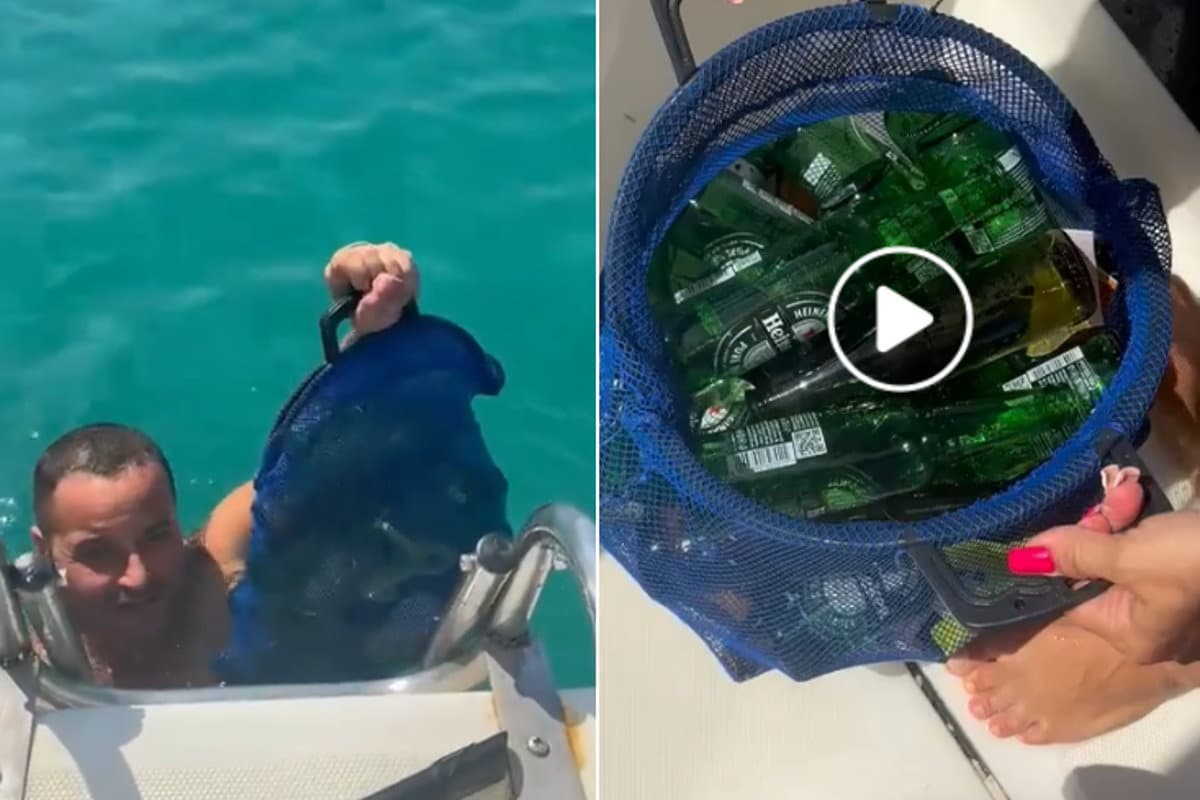 Dopo la diffusione sui social di un video che mostrava alcune persone a bordo di un gommone gettare bottiglie di birra in mare al largo dell’Isola delle Femmine, questo ragazzo si è tuffato per raccoglierne alcune e lanciare piuttosto un forte segnale