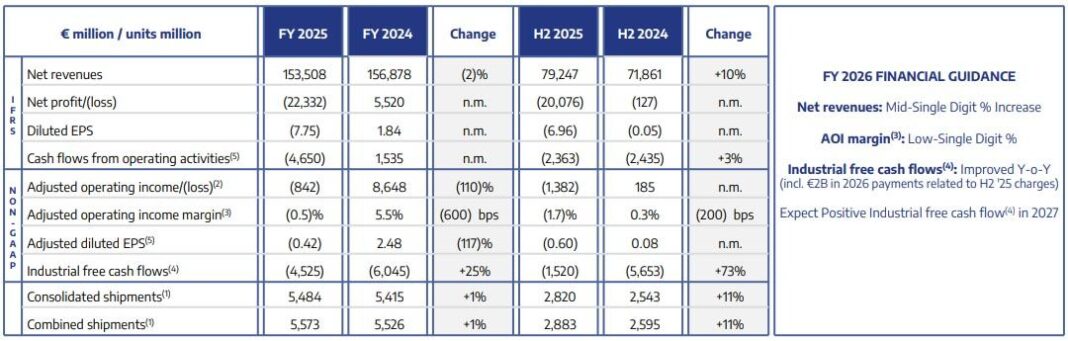 I risultati dell’esercizio 2025 di Stellantis hanno visto ricavi netti pari a 153,5 miliardi di euro, in calo del -2% rispetto al 2024, principalmente a causa degli effetti negativi dei tassi di cambio e del calo dei prezzi netti nel primo semestre dell’anno, parzialmente compensati