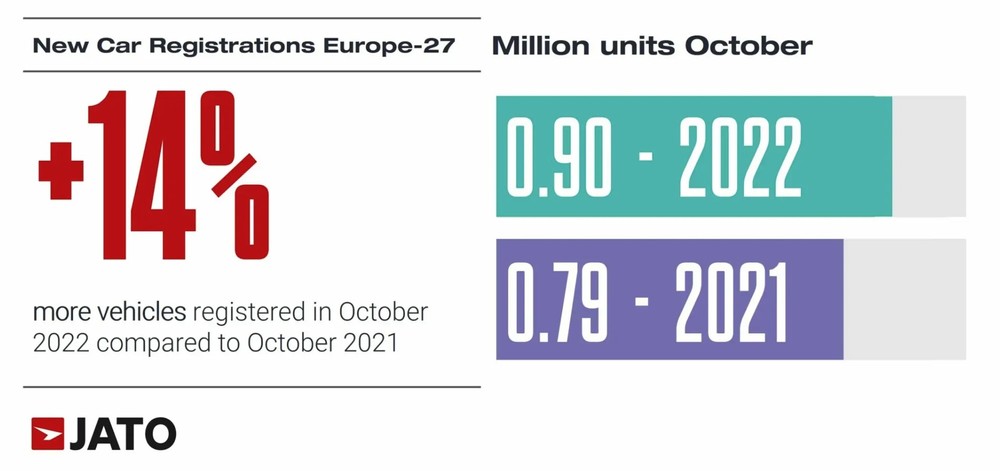 Il mercato auto ad ottobre 2022 è cresciuto del 14% rispetto allo stesso mese del 2021 facendo registrare 903.533 immatricolazioni, come riporta il nuovo rapporto mensile di Jato Dynamics. Si tratta del terzo mese consecutivo di crescita dopo un lungo periodo negativo. Tuttavia, la crescita dei mesi di agosto, settembre e ottobre non è stata sufficiente a compensare le perdite subite nei primi sette mesi dell’anno.
